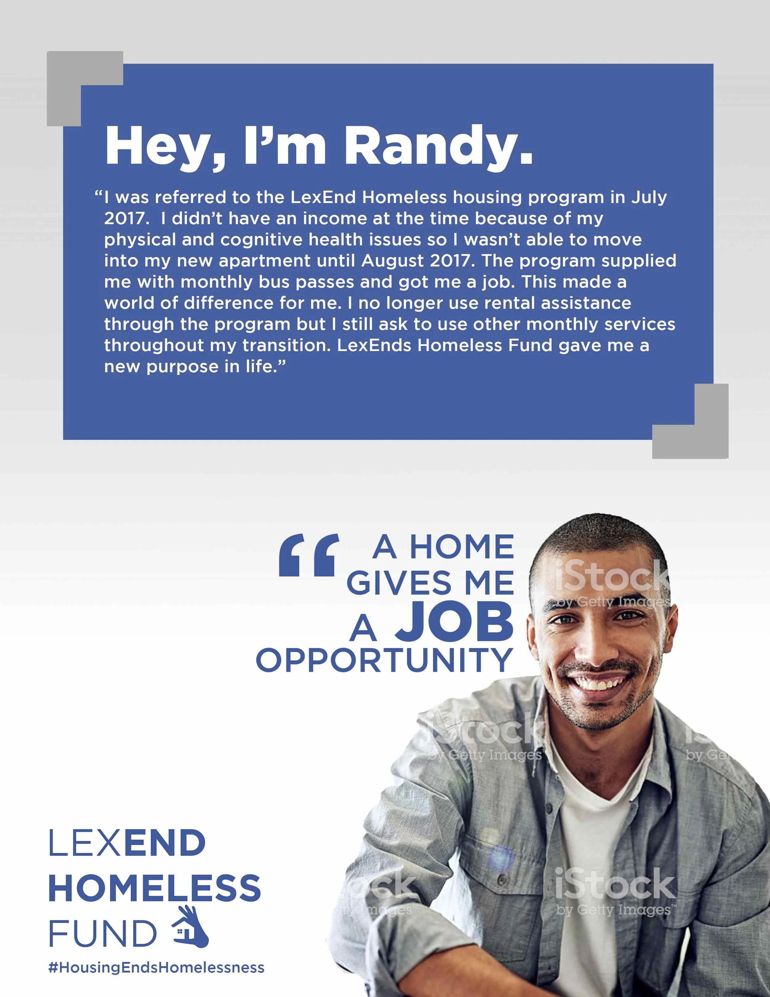 The magazine ads each portray a client story that will emotionally attract the audience, yet providing them with substantial evidence that LexEnd Homeless Fund works. The second print ad introduces a real client, named Randy, who found a job opportunity after the LexEnd Homeless Fund helped him find housing.